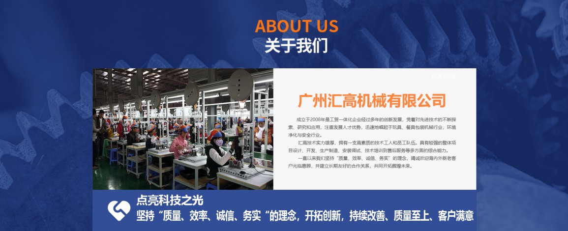 廣州匯高機械設備有限公司,成立于2008年是工貿一體化企業經過多年的創新發展,憑著對先進技術的不斷探索、研究和應用,注重發展人才優勢,迅速地崛起于玩具、餐具包裝機械行業,環境凈化與安全行業。